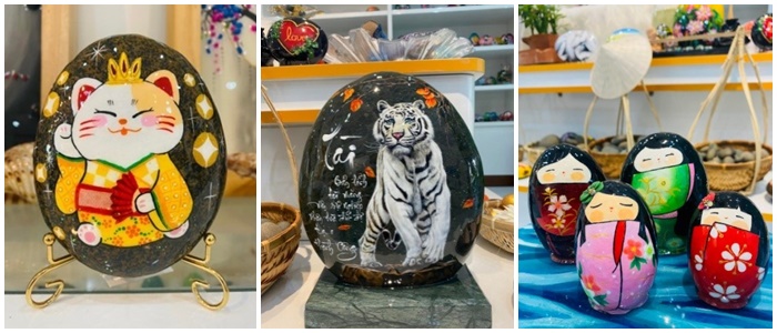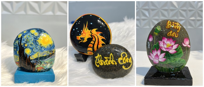 Các tác phẩm trên đá cuội được vẽ tay tỉ mỉ có tính nghệ thuật rất cao, có thể truyền tải những thông điệp yêu thương đến người thân, bạn bè …sau đó, đươc phủ keo đặc biệt bền chắc giúp sản phẩm đẹp lung linh và lưu giữ mãi với thời gian...làm vật trang trí cho ngôi nhà từ bàn làm việc, kệ phòng khách, sân vườn, kệ sách thậm chí trong phòng tắm..